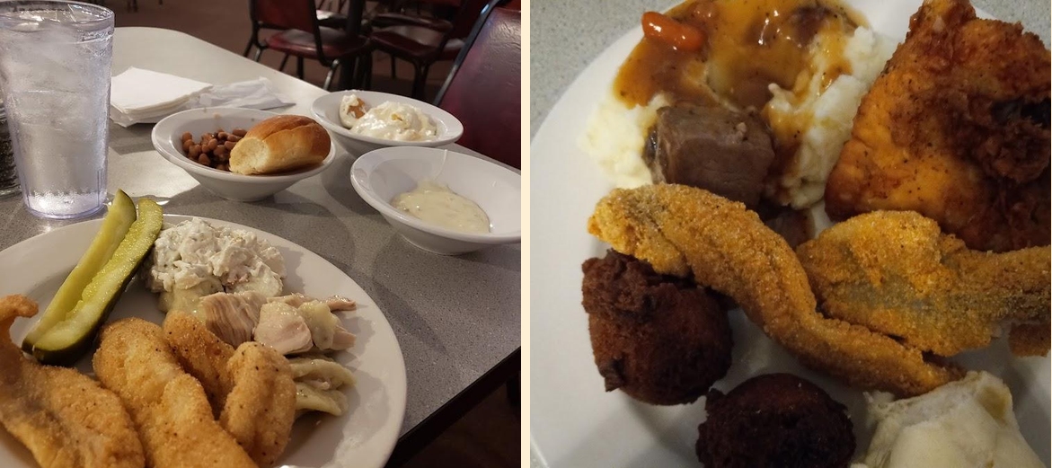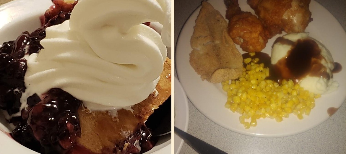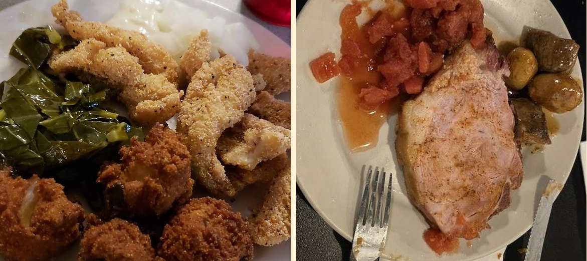 Don’t miss the fresh salad bar. It’s a great starting point or accompaniment to a heartier dish. Desserts such as cobblers and more complete the meal. Everyone leaves happy and satiated.